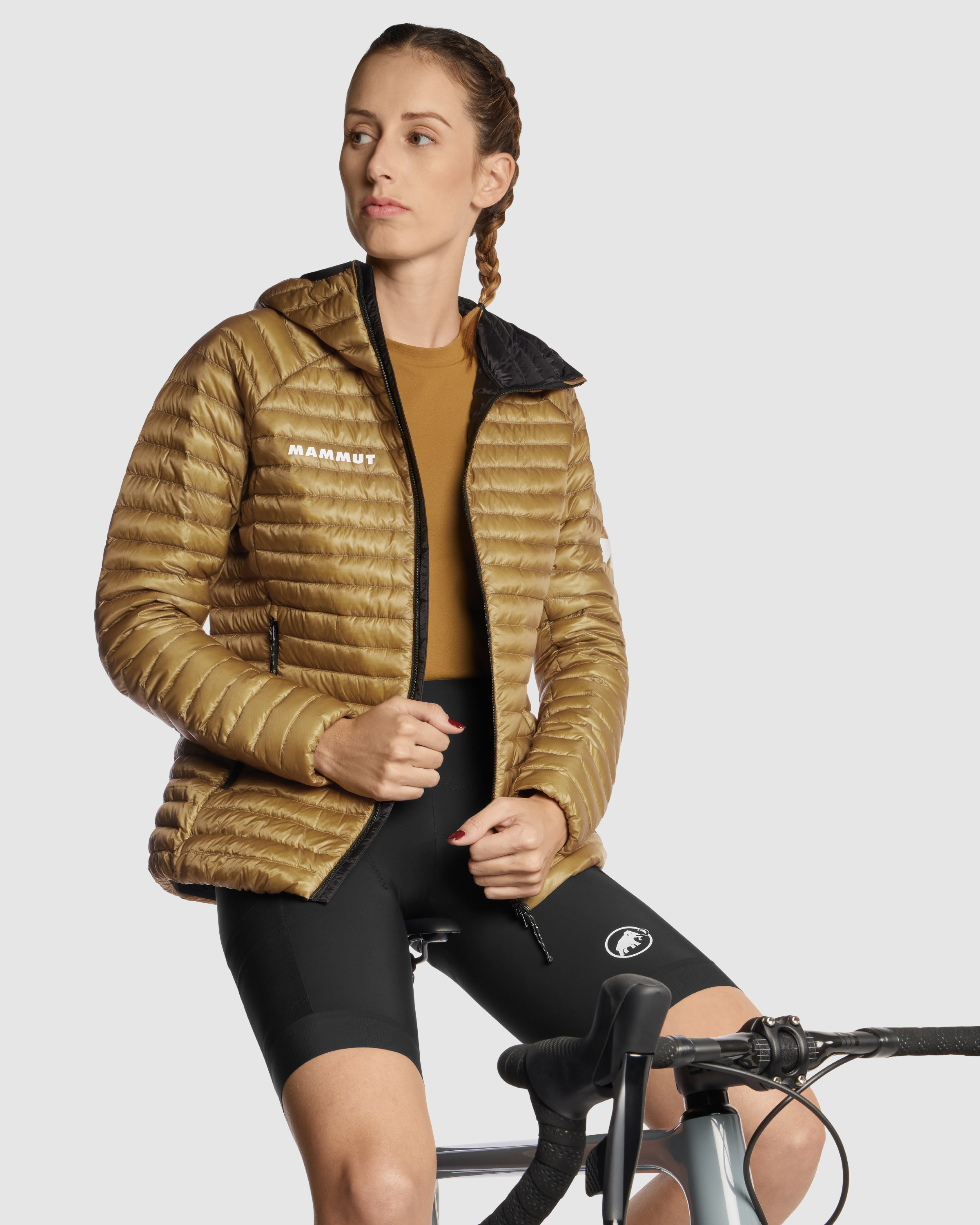 Ultralight and packable with cold-weather protection, this jacket is made in collaboration with Mammut for gravel bikepacking. Responsibly sourced, hydrophobic, 850-cuin-fill-power Mammut DRY DOWN is placed in small chambers of the Pertex® Quantum outer fabric for evenly dispersed warmth, while a PFC-free DWR finish defends against light precipitation. A 2-way front zipper allows for a versatile fit and harness compatibility. As an extra-warm outer layer or a small-packed thermal backup in a bike bag, the ASSOS x Mammut Aenergy IN Hooded Jacket provides lightweight insulation without compromise.