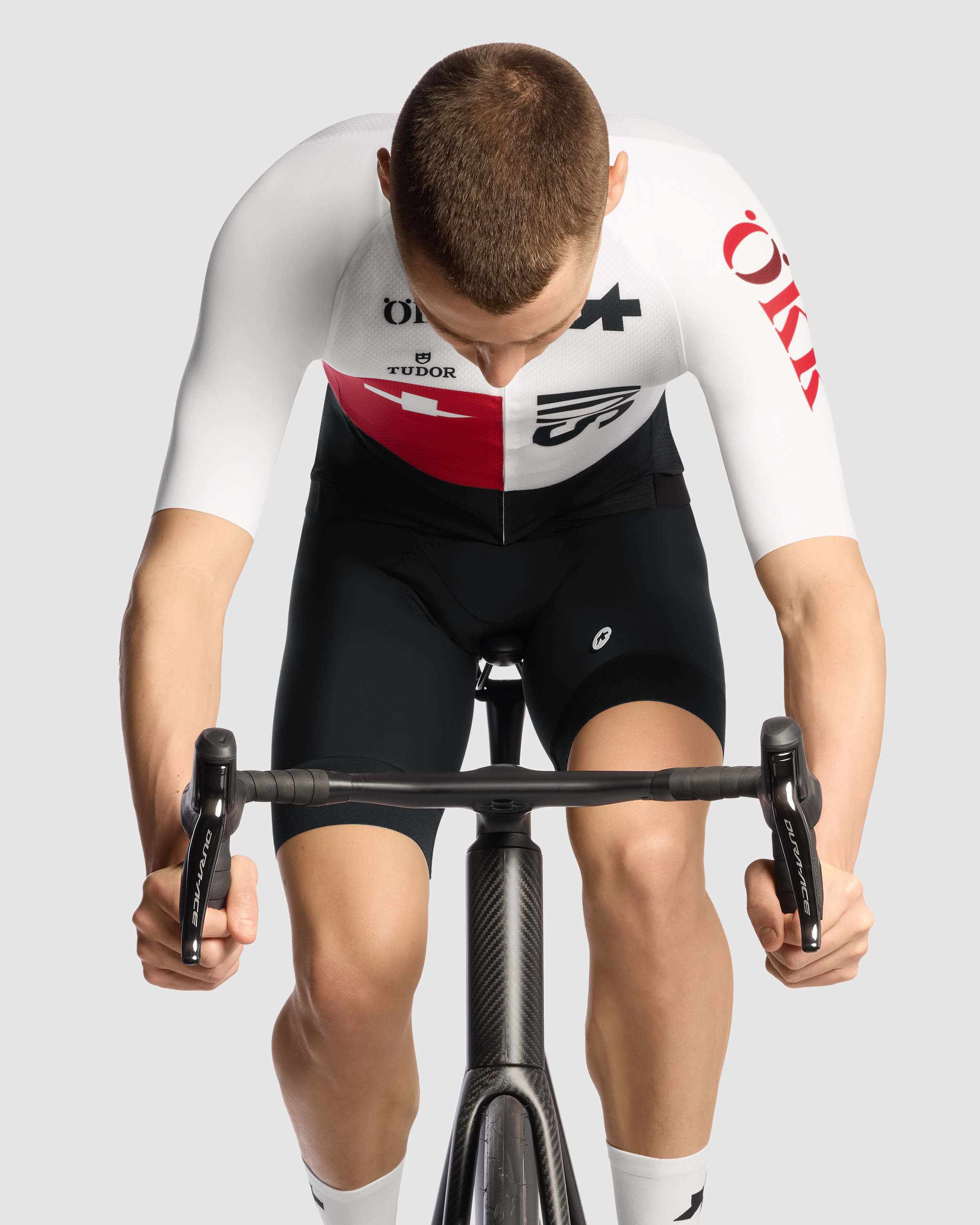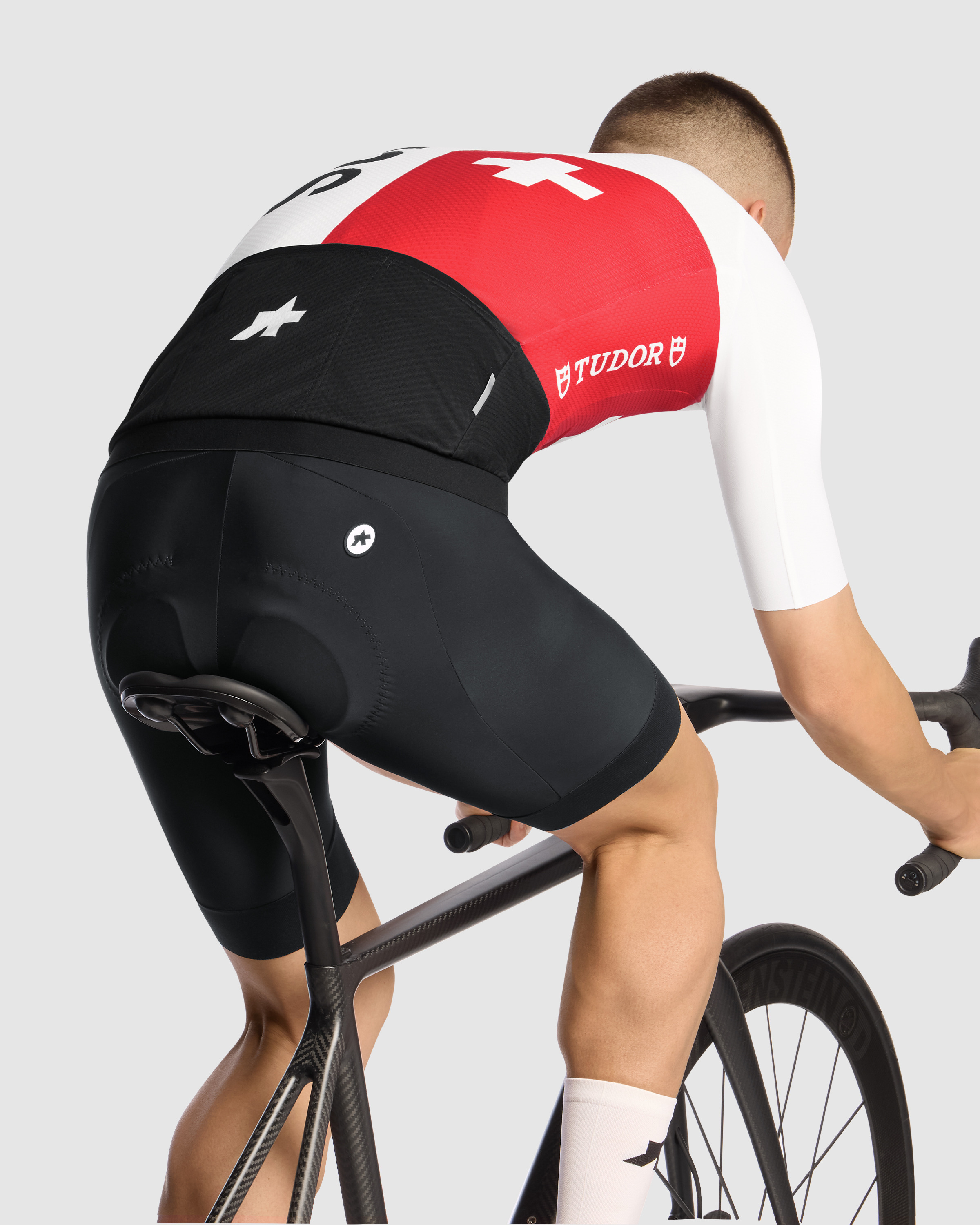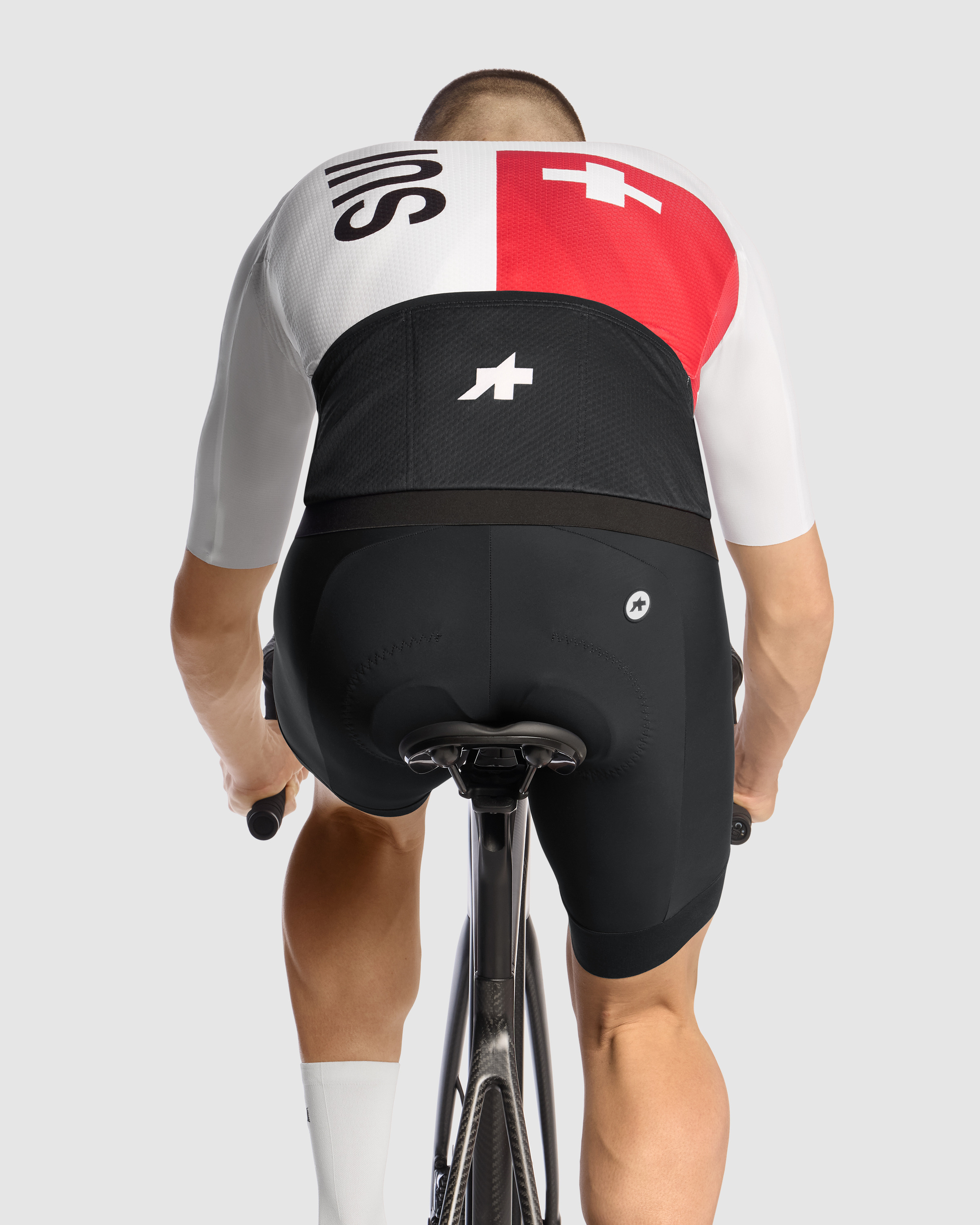 The ASSOS x Swiss Cycling jersey is a piece we look forward to each year, featuring the clean graphics, logos, and patterning befitting the precision behind these two iconic Swiss groups. For the C2 EVO GT jersey, we opened the front of the collar and updated the fit across the chest and throat, relieving pressure for easier breathing and less restriction. The sleeves and collar feature a material that shaves 15g (size medium) off the previous jersey’s weight while retaining the highly elastic, wrapping fit and active moisture-management. The new bonded hem and zipper reduce friction between layers and rippling across the stomach while in the riding position.